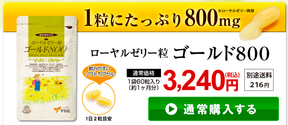 本日は、大手サプリメーカーでおなじみ・やわたの「ローヤルゼリー粒ゴールド800」について徹底紹介したいと思います。